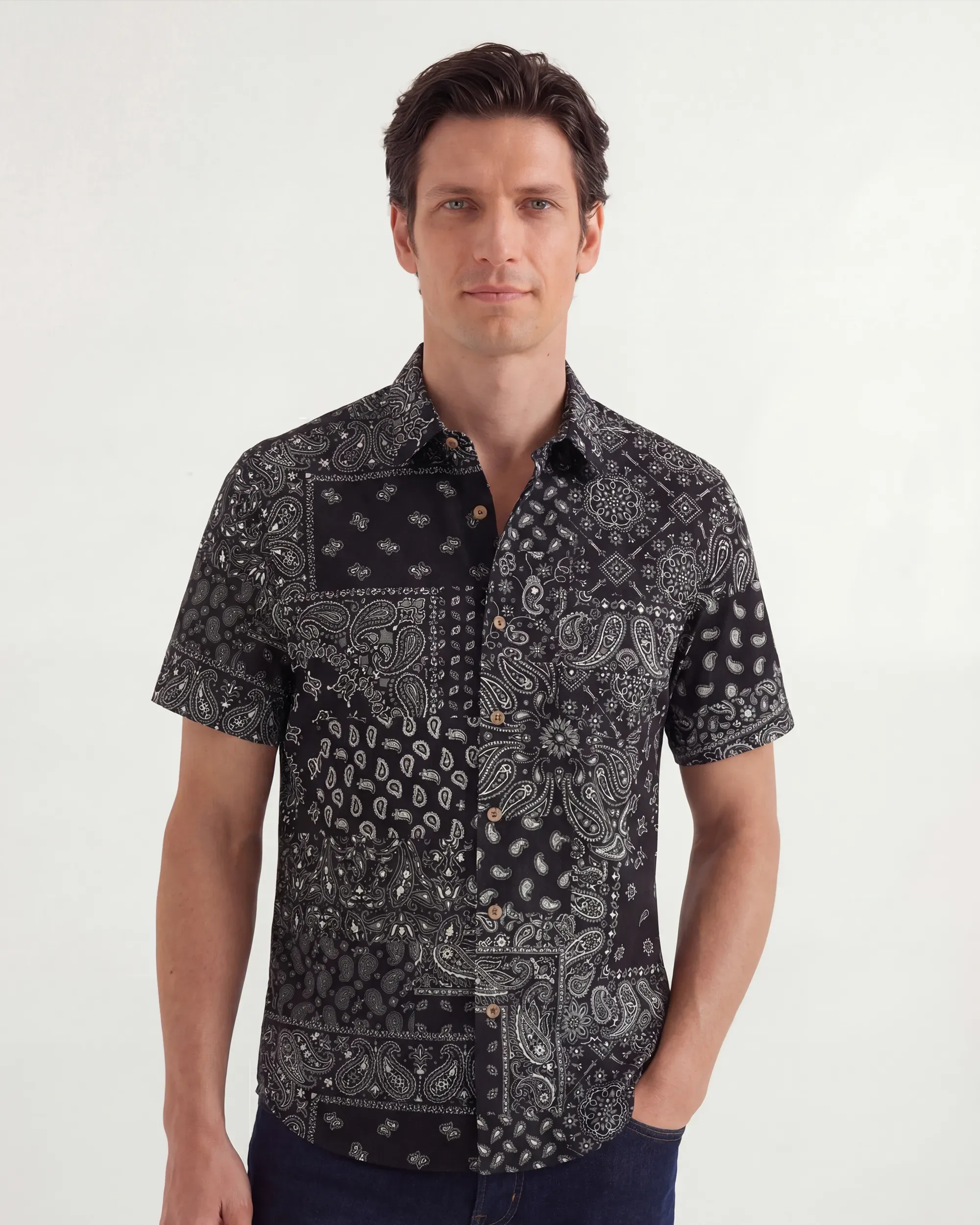 - Botton-up collar, short sleeve, buttons closure, with pocket(s)