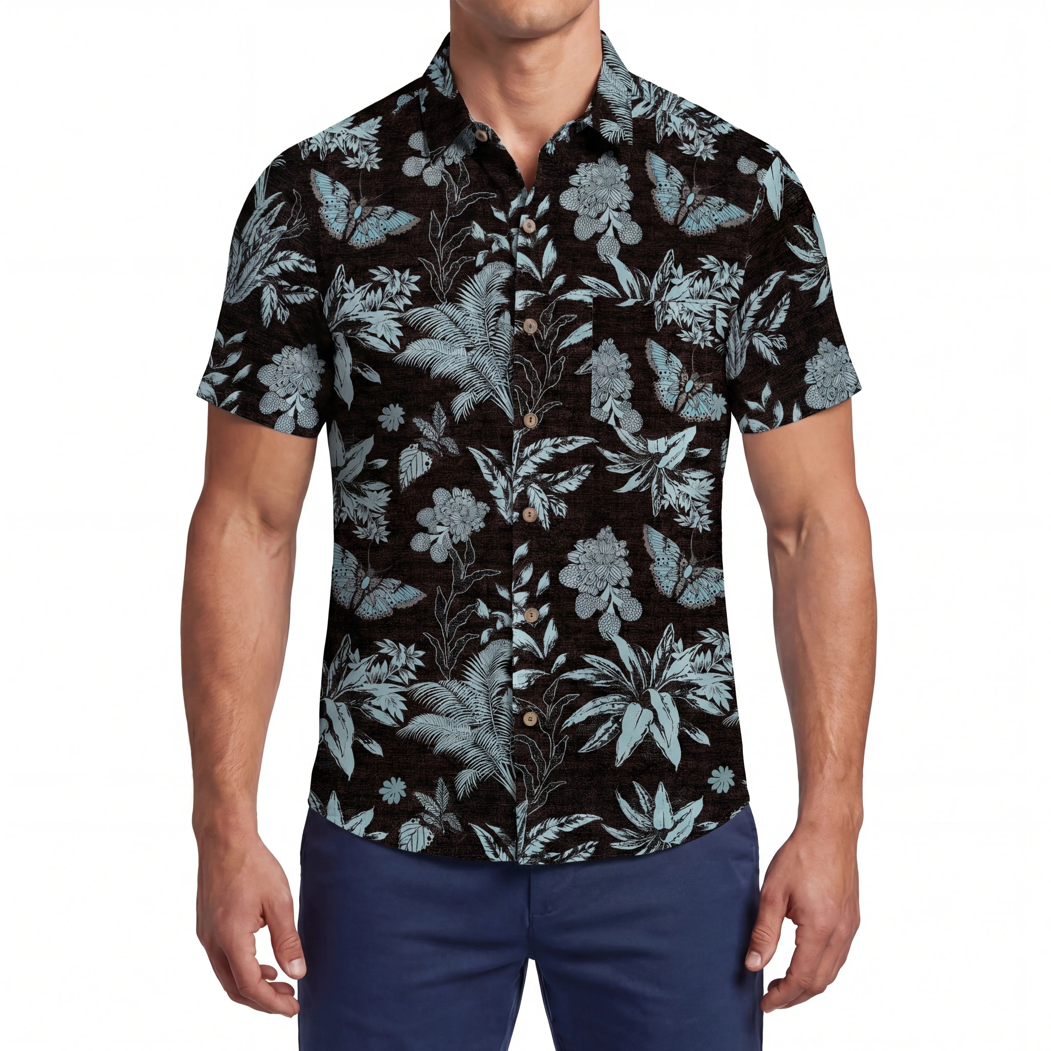 - Botton-up collar, short sleeve, buttons closure, with pocket(s)