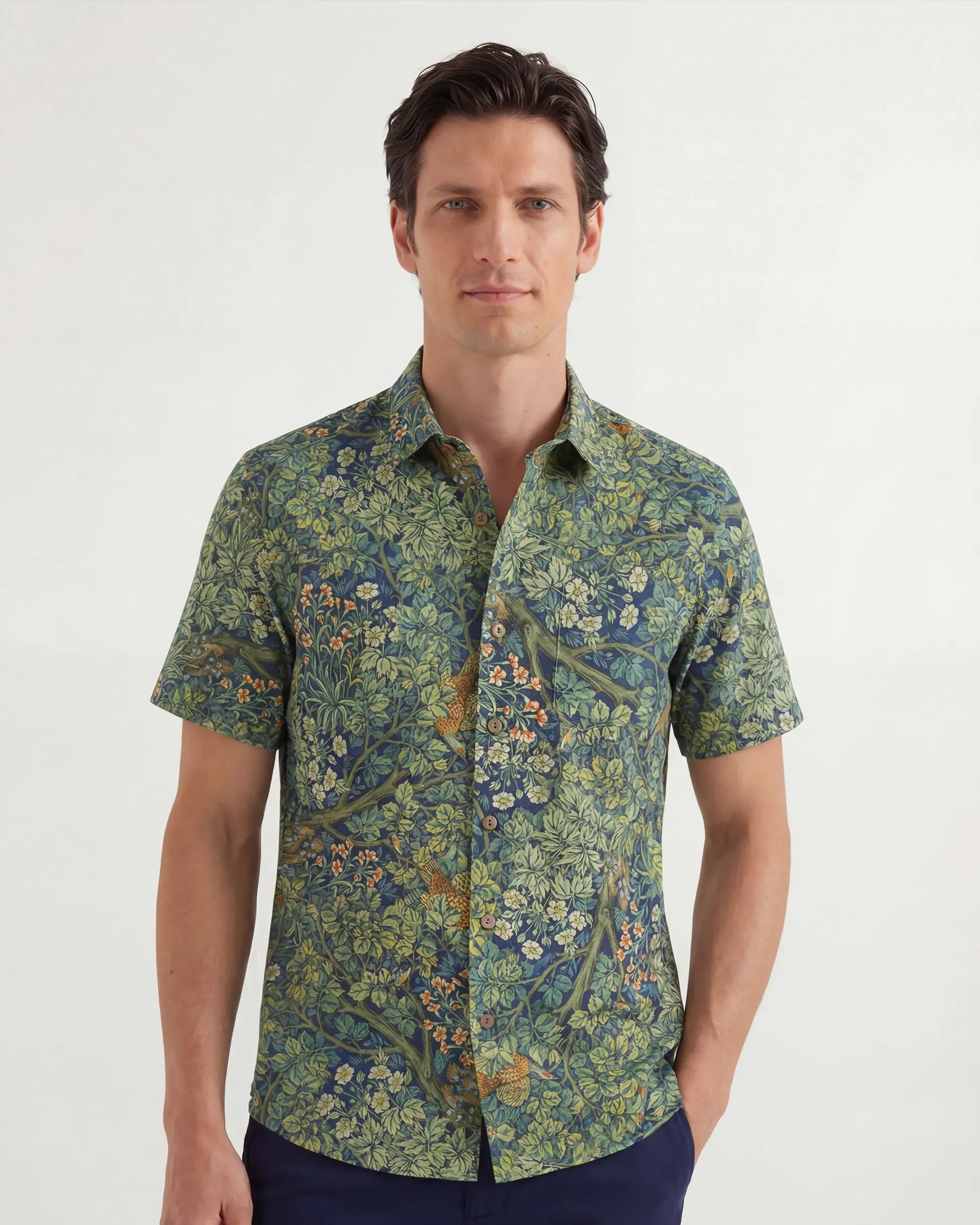 - Botton-up collar, short sleeve, buttons closure, with pocket(s)