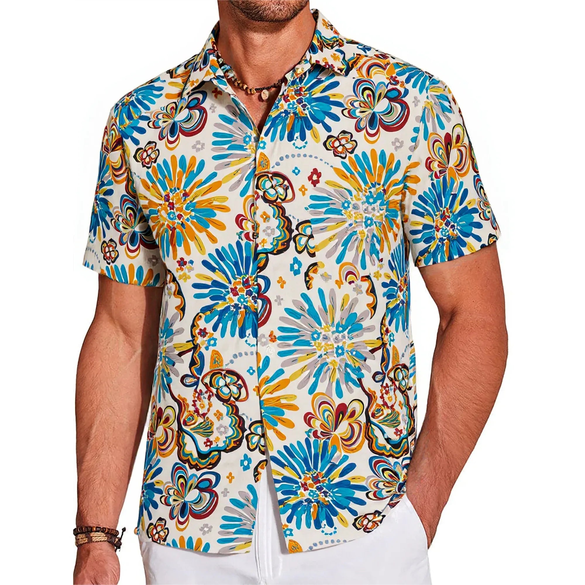 LeosWare® Men's Hawaiian Shirt Short Sleeve Button-up 100% Cotton Blue Aloha Vibrant And Colorful Artistic Flowers